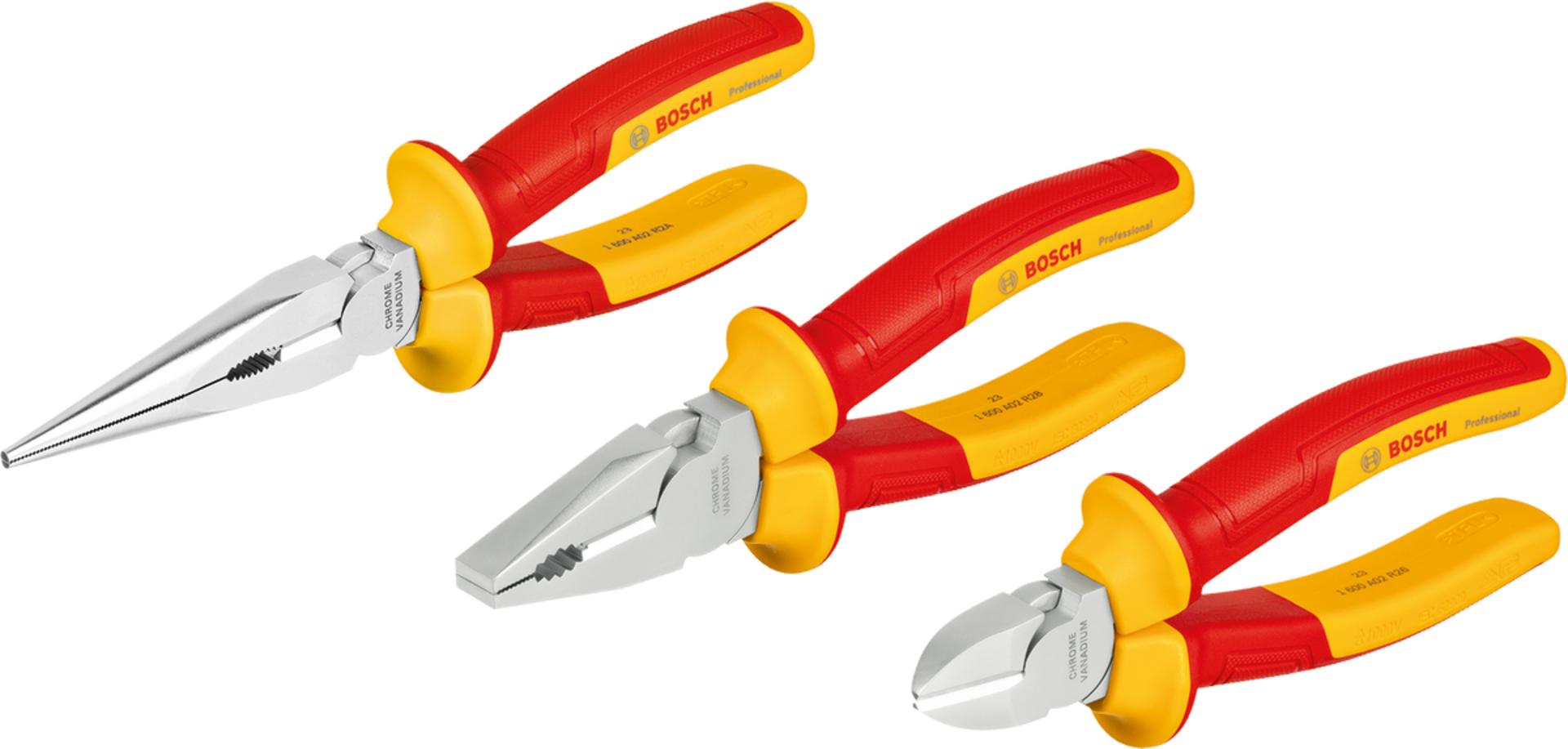 As a professional tradesperson, you need tools that are easy to use and meet all legal requirements. With the Bosch Professional VDE pliers set (3 pieces), you can grasp or pull objects like nails, or cut objects like wires, even if you unexpectedly make contact with live parts. These standard-compliant tools are insulated with Thermoplastic Polyurethanes (TPU). They have been tested up to 10,000 volts and VDE-certified up to 1,000 volts according to DIN EN/IEC 60900. You will find the VDE pliers convenient to handle and easy to use, even with one hand. They grasp and cut well, and last a long time. All pliers in the set are made of robust chrome vanadium steel and have hardened cutting edges. With VDE hand tools added to our Bosch Professional range, you get all your tool requirements in reliable Bosch quality. , The 3-piece set contains VDE combination pliers (180 mm), a VDE diagonal side cutter (160 mm), and VDE long nose pliers (200 mm). All pliers have an ergonomic soft grip with an insulating protective Thermoplastic Polyurethanes (TPU) coating on the handle. This set comes in a 1/2 L-BOXX inlay, which is perfectly compatible with our Bosch Mobility System.