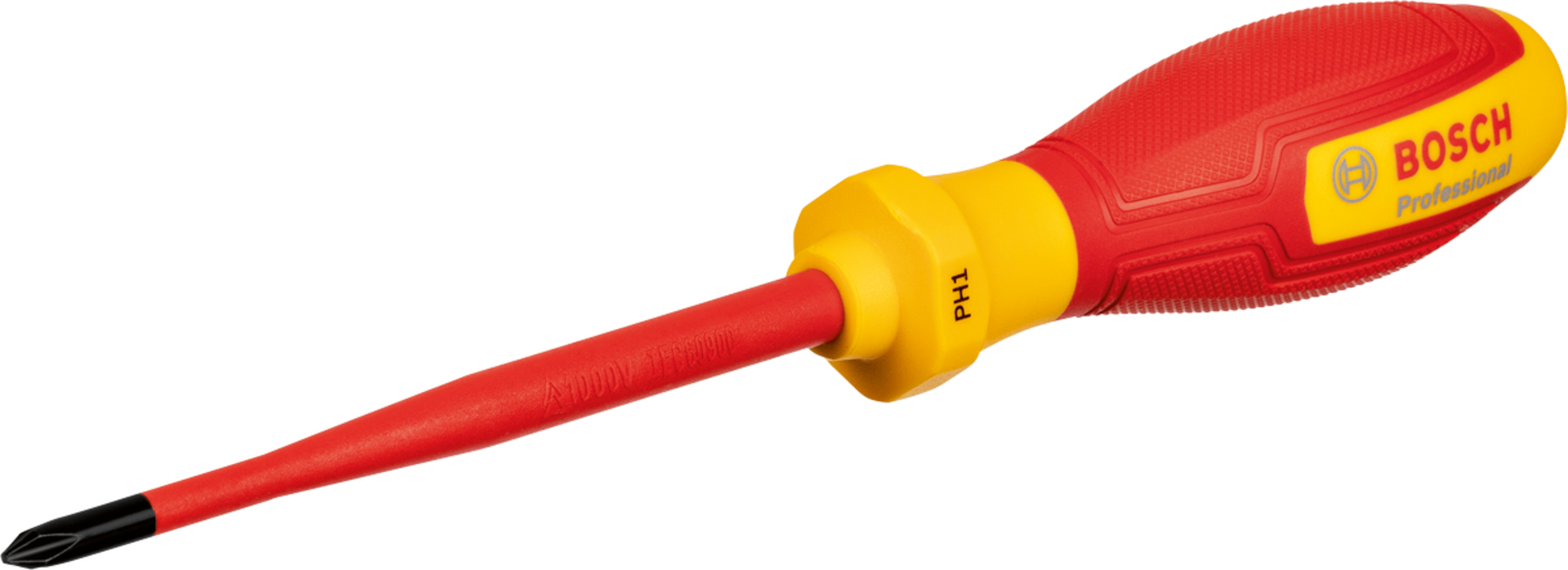 As a professional tradesperson, you need tools that are easy to use and meet all legal requirements. With the Bosch Professional VDE PH1x100 screwdriver, you can fasten and unfasten screws, even if you unexpectedly make contact with live parts. This standard-compliant tool is insulated with Thermoplastic Elastomer (TPE). It has been tested up to 10,000 volts and VDE-certified up to 1,000 volts according to DIN EN/IEC 60900. Our VDE screwdriver is precise and durable; its slim shaft and robust tip ensure fitting accuracy. You’ll find its soft grip and superior ergonomic design hand-friendly and comfortable to work with. The screwdriver’s S2 blade has an insulating protective coating and the handle is insulated with TPE. By adding VDE hand tools to our Bosch Professional range, you get all your tool requirements in reliable Bosch quality. , Bosch Professional VDE screwdrivers have an anti-roll design that prevents the tool rolling away in the workplace. Plus the profile and size are clearly visible on multiple positions on the handle.