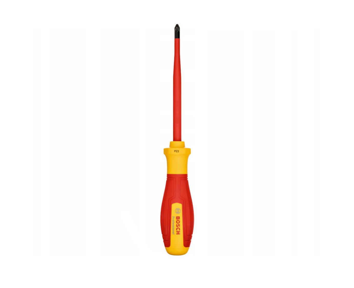 As a professional tradesperson, you need tools that are easy to use and meet all legal requirements. With the Bosch Professional PZ2x125 screwdriver, you can fasten and unfasten screws, even if you unexpectedly make contact with live parts. This standard-compliant tool is insulated with Thermoplastic Elastomer (TPE). It has been tested up to 10,000 volts and VDE-certified up to 1,000 volts according to DIN EN/IEC 60900. Our VDE screwdriver is precise and durable; its slim shaft and robust tip ensure fitting accuracy. You’ll find its soft grip and superior ergonomic design hand-friendly and comfortable to work with. The screwdriver’s S2 blade has an insulating protective coating and the handle is insulated with TPE. By adding VDE hand tools to our Bosch Professional range, you get all your tool requirements in reliable Bosch quality. , Bosch Professional VDE screwdrivers have an anti-roll design that prevents the tool rolling away in the workplace. Plus the profile and size are clearly visible on multiple positions on the handle.