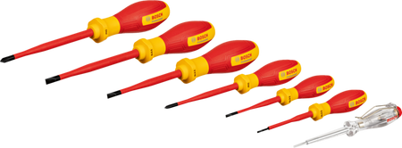 As a professional tradesperson, you need tools that are easy to use and meet all legal requirements. With the Bosch Professional VDE screwdriver set SL/PH with single-pole phase tester (7 pieces), you can fasten and unfasten screws, even if you unexpectedly make contact with live parts. All VDE screwdrivers are insulated with Thermoplastic Elastomer (TPE), their S2 blades have an insulating protective coating and they come with hand-friendly soft grips. The slim shafts and robust tips of the screwdrivers SL 3,5 / 5,5 / 6,5 / PH 1 and PH2 ensure fitting accuracy. All VDE screwdrivers have been tested up to 10,000 volts and VDE-certified up to 1,000 volts according to DIN EN/IEC 60900. The Bosch Professional single-pole phase tester is certified according to DIN VDE 0680-6. With this voltage tester, you can determine whether or not there is an existing current. It detects voltages from AC 100 V – 250 V and there’s an integrated glow lamp that alerts you if a current is present. It has a handy and sturdy pocket clip. Our VDE hand tools are precise and durable and thanks to their ergonomic design, all hand tools in this set are comfortable to work with. By adding VDE hand tools to our Bosch Professional range, you get all your tool requirements in reliable Bosch quality. , This set consists of 6 VDE screwdrivers: SL 2,5 / 3,5 / 5,5 / 6,5 / PH1 and PH2 and one single-pole phase tester SL3. All tools in this set have an anti-roll design that prevents them from rolling away in the workplace. Profile and size are clearly visible on multiple positions on the handles of all our VDE screwdrivers. This set comes in a 1/2 L-BOXX inlay, which is perfectly compatible with our Bosch Mobility System.