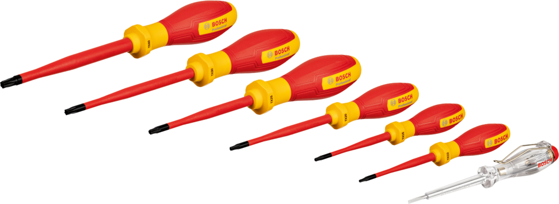 As a professional tradesperson, you need tools that are easy to use and meet all legal requirements. With the Bosch Professional VDE screwdriver set TX with single-pole phase tester (7 pieces), you can fasten and unfasten screws, even if you unexpectedly make contact with live parts. All VDE screwdrivers are insulated with Thermoplastic Elastomer (TPE), their S2 blades have an insulating protective coating and they come with hand-friendly soft grips. The slim shafts and robust tips of the screwdrivers ensure fitting accuracy. All VDE screwdrivers have been tested up to 10,000 volts and VDE-certified up to 1,000 volts according to DIN EN/IEC 60900. The Bosch Professional single-pole phase tester is certified according to DIN VDE 0680-6. With this single-pole phase tester, you can determine whether there is an existing current. It detects voltages from AC 100 V – 250 V and there’s an integrated glow lamp that alerts you if a current is present. Our VDE hand tools are precise and durable and thanks to their soft grip and ergonomic design, all hand tools in this set are comfortable to work with. By adding VDE hand tools to our Bosch Professional range, you get all your tool requirements in reliable Bosch quality. , This set consists of 6 VDE screwdrivers TX10 / TX15/ TX20 / TX25 / TX30 / TX40 and 1 single-pole phase tester SL3. All tools in this set have an anti-roll design that prevents them from rolling away in the workplace. Profile and size are clearly visible on multiple positions on the handles of all our VDE screwdrivers. This set comes in a 1/2 L-BOXX inlay, which is perfectly compatible with our Bosch Mobility System.