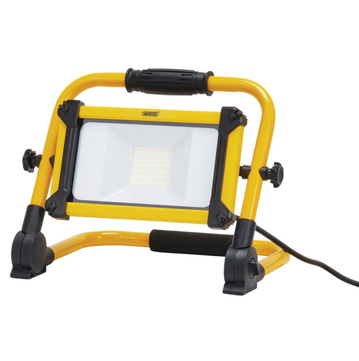 This 2,200 lumens slim and adjustable folding SMD LED site light gives an even spread of light through a beam angle of 100 degrees. The colour temperature is 6,000 to 6,500K – cool white to daylight – meaning fewer shadows. This IP65 and IK06 rated site light is made from cast aluminium, carbon steel and toughened glass and is suitable for industrial use. It has bumpers for protection and comes supplied with a 1.8m VDE cable and an approved 230V plug. This 2,200 lumens slim and adjustable folding SMD LED site light is part of a wide range of SMD LED site lights available from Draper Tools.