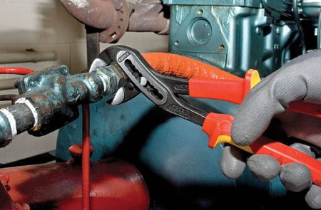 Professional Quality, tested to 10,000V and insulated to 1000V AC and 1500V DC for live line working. Manufactured from chrome vanadium electric steel, oil hardened and tempered with smoothly ground jaws, joint faces and an accurately formed box joint. Nine position adjustment. The parallelogram-shaped gripping surfaces have specially hardened teeth to 61HRC for positive grip on pipes and nuts. Heavy insulated handles with slip guards for extra safety. Has 'no-nip' feature which prevents handles locking together and damaging users' hands.