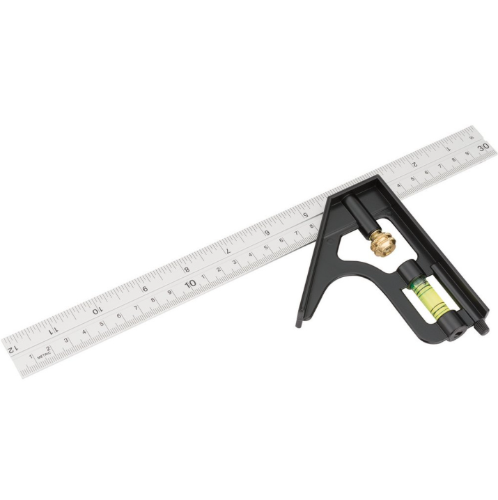 Made from matt black metal stock with polished faces, the 300mm combination square has a brass adjusting screw, spirit level and scriber. The stainless steel blade is graduated on both sides with metric and imperial measurements along either edge.