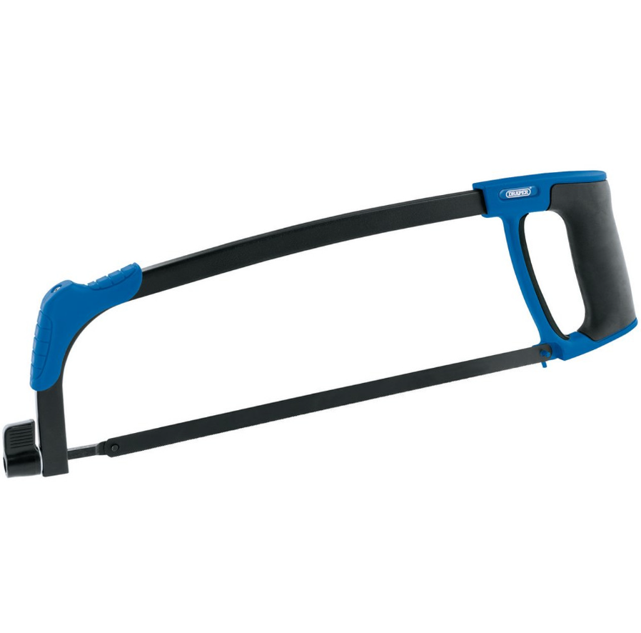 Steel tube with an ergonomic soft grip plastic handle. Frame has two sets of blade spigots which allows straight or 90° cutting. Supplied with a 300mm bi - metal blade.