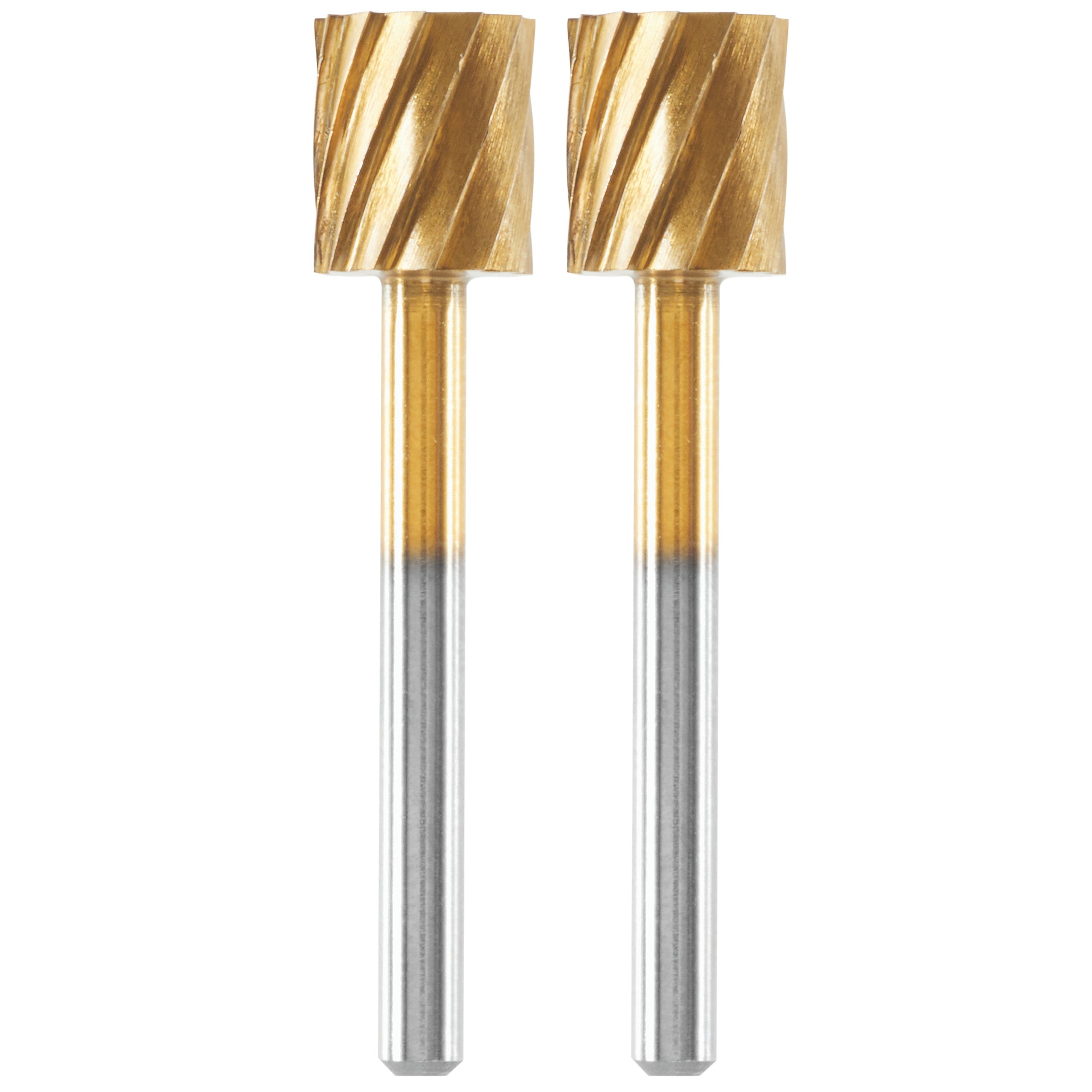 The heavy-duty Dremel Max Carving Bit 115DM is coated in Titanium Nitride to last 2 times longer than the standard, non-coated accessory. Remove material with precision for applications like, carving, freehand routing, shaping and hollowing in a wide range of materials. Ideal for your carving and engraving projects in wood, plastic and soft metals such as aluminium, copper and brass. Expand your possibilities with these attachments: Flexible Shaft (225); Flex-Shaft Tool Holder (2222); Detailer's Grip Attachment (577); Multi-Vise (2500)|Recommended speed (RPM):|Aluminium 30.000 Brass 30.000 Copper 30.000 Hardwood 35.000 Softwood 20-25.000 Plastic 35.000 Steel 20-25.000