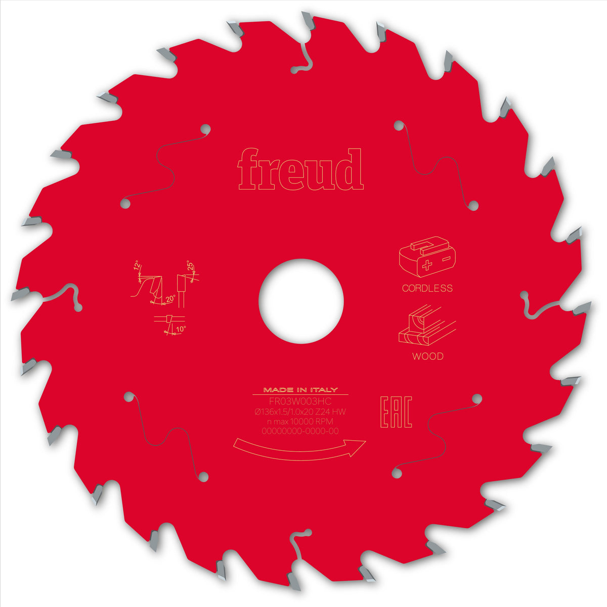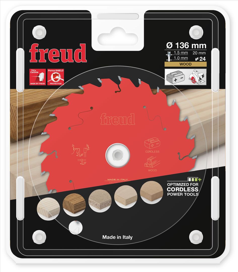 Maximised battery runtime of your cordless saw due to special thin-kerf tooth design. Made for handheld saws, ideal for cutting hard wood, soft wood, plywood, chipboard and MDF. A specially formulated, highly compact Titanium Cobalt Carbide (TiCo), engineered and manufactured by freud. It provides a sharper edge and flawless finish with a dramatically longer cutting life. Perma shield technology is a non-stick coating formulation that withstands the toughest applications. It provides thermal insulation, protects from corrosion and eliminates resin build-up, reducing downtime for cleaning.