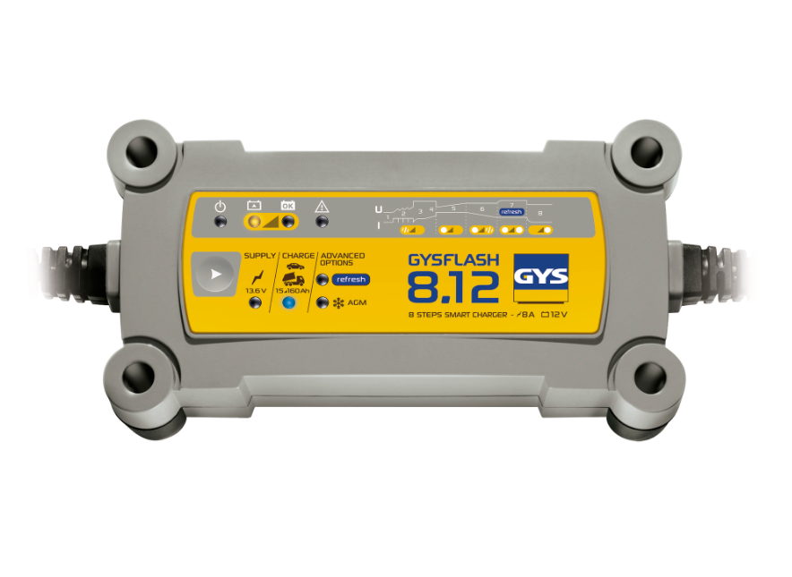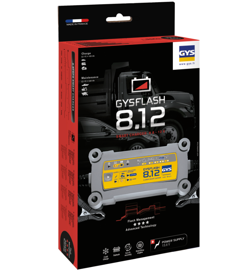 The GYSFLASH 8.12 is specifically designed to charge all types of’ 12V batteries such as cars, utility vehicles, motor homes or trucks. It features an 8 step intelligent charging curve for an optimal charge; as well as a «Supply» mode to support and maintain showroom vehicle batteries.