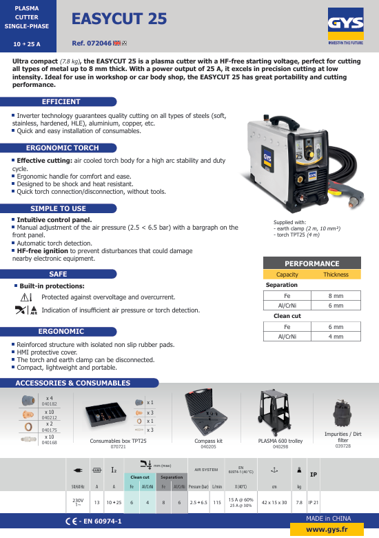 Ideal for maintenance and bodywork work, the EASYCUT 25 plasma cutter easily cuts all types of metal up to 8 mm thick. With 25 A of power, it excels at low-intensity precision cutting.