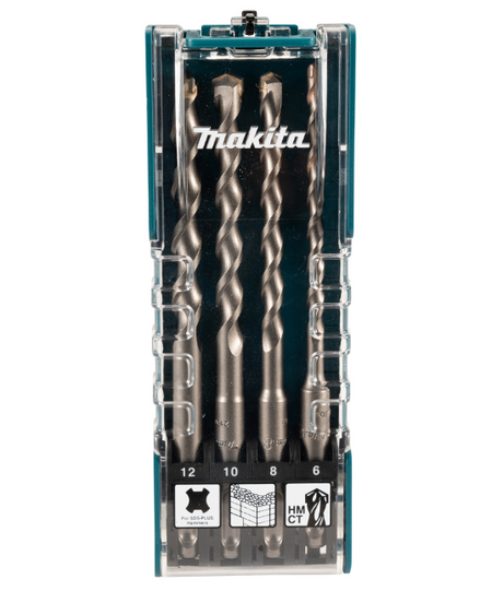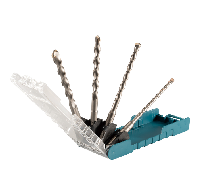 SDS-PLUS hammer drill bit set for drilling masonry & concrete. The solid carbide tip with centreing point & optimised flutes offers fast drilling speeds and increased working efficiency. The set includes 6x160, 8x160, 10x160, and 12x160mm drill bits.