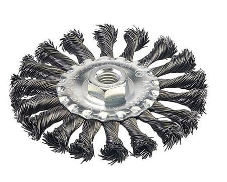 High tensile steel wire, 0.5mm diameter, for rust and paint removal, descaling, deburring and preparation of welding seams. For metal and stone working, cleaning, surface preparation and fabrication tasks. Use with angle grinders. M14 x 2 female thread. Max 12,500rpm.