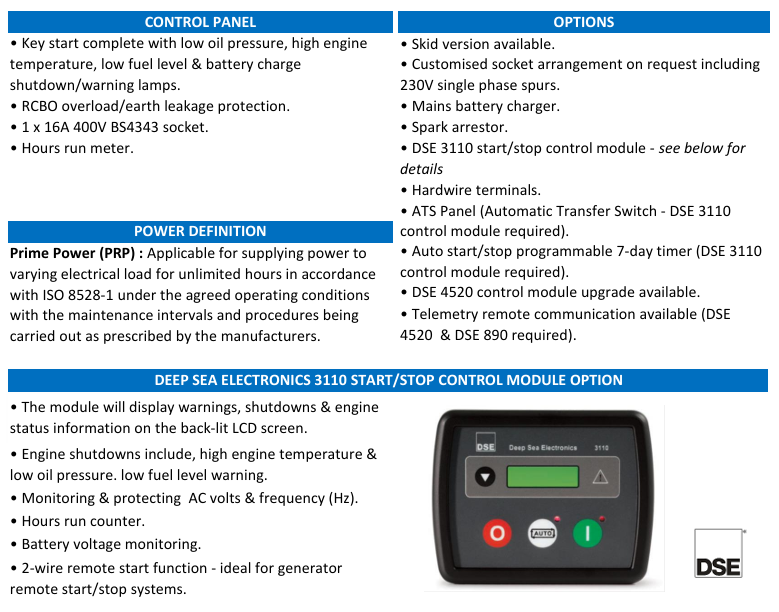 - Options: Skid version, DSE 3110 module, Mains battery charger, 7-day Start/Stop timer, DSE 4520 module, Telemetry, ATS panel & Spark arrestor