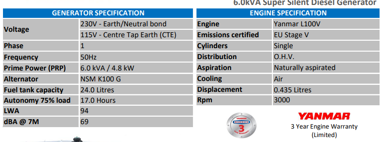 Complete with close fitting acoustic canopies and long run fuel tanks. Providing super silent, highly portable and versatile power for demanding applications including hire and construction sectors. Excellent maintenance access and two wheel site trolley.