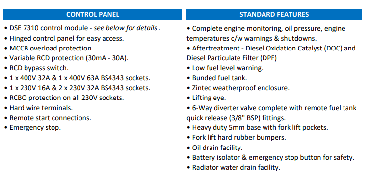 - Options: Road tow trailer, ATS panel, Engine coolant heater, Mains battery charger, Powerlock (Litton) connectors, Air intake shutdown valve & spark arrestor, Telemetry remote communication, Synchronization / Load sharing