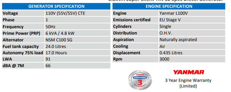 Stephill SSG6000DEC 6.0 kVA / 4.8 kW Yanmar L100VES Diesel Generator