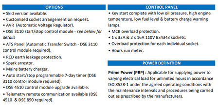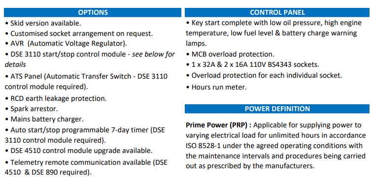 - Options: Skid mounted version, AVR, DSE 3110 module (2-wire start/stop), RCD, Mains battery charger, Spark arrestor